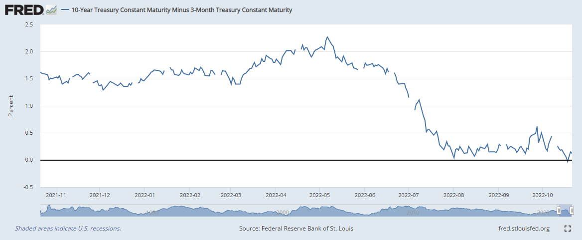 그리고 심지어 2022년 10월 18일을 기준으로 미국의 10년 물 채권 금리와 3개월 물 채권 금리도 역전되었었습니다. 현재는 다시 올라오긴 했으나 계속 들여다볼 필요가 있어 보이죠?