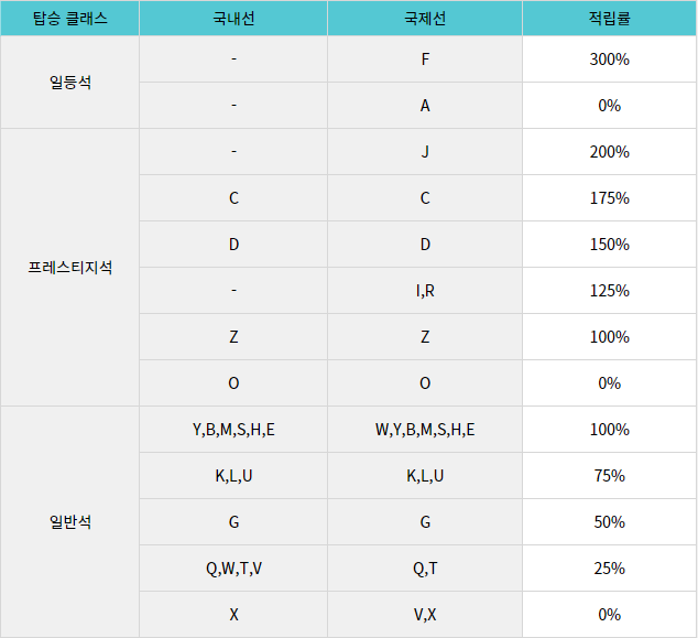 위 표처럼 일등석 F등급의 적립률이 기존 165%에서 300%, 프레스티지석은 J등급 기준 기존 135%에서 200%로 대폭 상향되었고, 일반석의 경우 W, Y, B, M, S, H, E 등급은 이전과 동일하지만 K, L, U 등급은 기존 100%에서 75%, G등급은 기존 80%에서 50%로 더 낮아졌습니다.