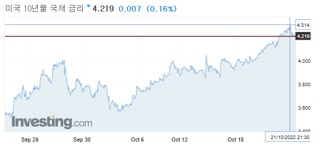 2022년 10월 21일 (한국 시간 기준), 미국 10년 물 국채 금리는 4.314%를 찍고 내려왔는데요. 지금도 4.2%를 유지하고 있습니다. 4.2%를 넘은 건 금융 위기 때였던 2008년 이후 14년 만에 처음이라고 합니다. 그리고 연준의 정책에 더 민감한 미국 2년 물 국채 금리는 4.63%를 찍고 내려왔는데 이는 2007년 이후 15년 만이라고 하네요. 시장 이런 신호를 본다면 11월 3일로 예정되어있는 연준의 기준 금리 발표 때 금리 인상은 확실시된다고 볼 수 있겠죠?