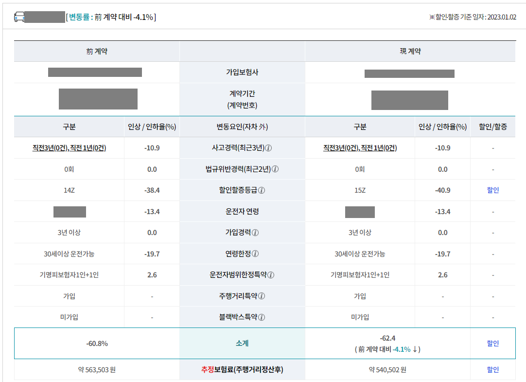 위와 같은 로그인 화면이 나오고 이름과 주민등록번호 입력 및 인증을 마치면 아래와 같이 전년 대비 보험료가 얼마나 할인을 받았는지 또는 할증되었는지 확인해볼 수 있습니다.