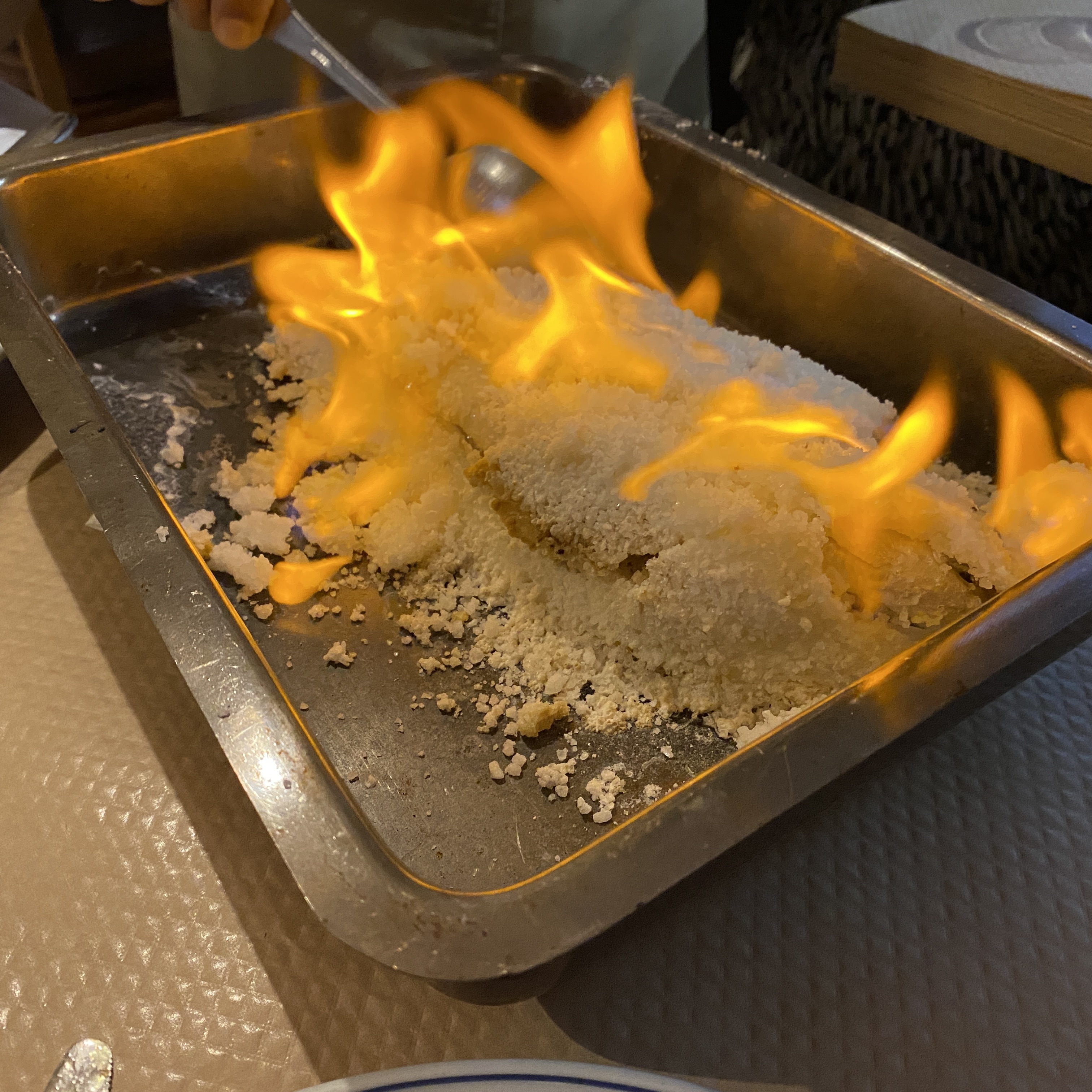 제가 시킨 요리는 문어밥(Octopus Rice과 소금농어구이(Saltcrusted Seabass) 그리고 그린와인입니다. 이 식당에서 한국인들에게 잘 알려진 메뉴는 바로 문어밥인데요. 해물향도 많이 나고 눌어붙은 볶음밥이 너무 맛있었습니다. 한국인들 누른밥 좋아하잖아요.. 딱 그 식감을 잘 살린 느낌이었고 간은 약간은 짜긴 했지만 저에게는 딱이었습니다. 그리고 소금농어구이는 아래 사진에서 보실 수 있는 것처럼 서빙하기 전에 소금에 불을 붙여주시는데요. 덕분에 식당 모든 사람들의 시선을 받을 수 있었답니다. ㅎㅎ 소금에 싸인 농어는 살이 통통하고 엄청 부드러웠어요. 매우 짤 것처럼 보이지만 생각보다 짜진 않았고 부드러운 생선살을 느낄 수 있었습니다. 여기에 그린와인 페어링은 또 기가 막혔지요... 포르투갈에 가시는 분들은 그린와인은 꼭 드셔보시길 바라요! 새콤달콤한 것이 해산물들이랑 참 잘 어울린답니다. :)